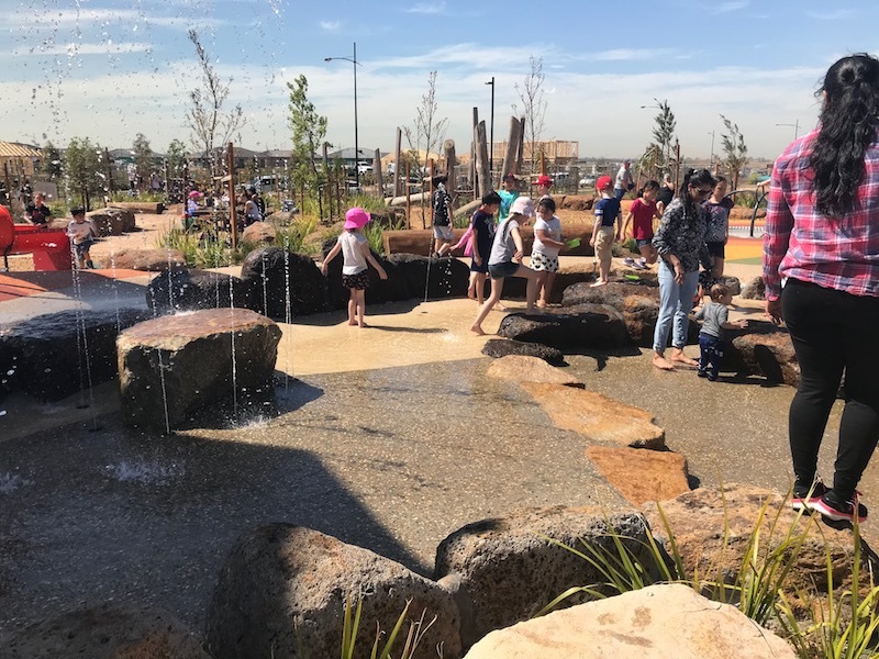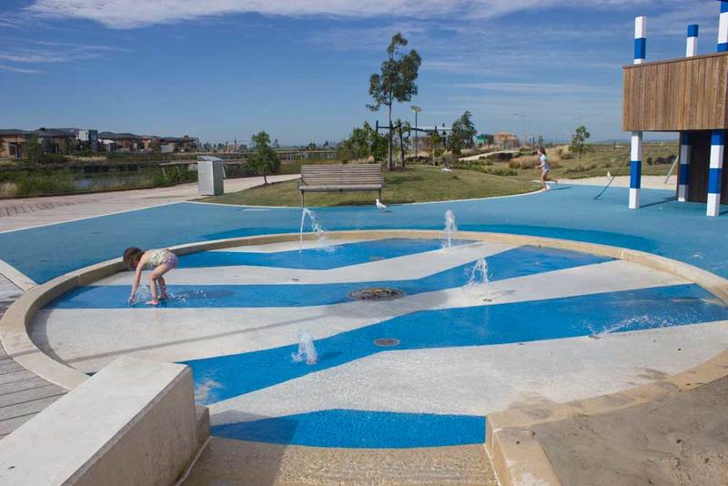 One of the new kids on the block as far as playgrounds go is also a hot spot for free water play - the Village Park Playground in the Riverwalk Estate in Werribee absolutely delivers with two splash parks of differing activities.