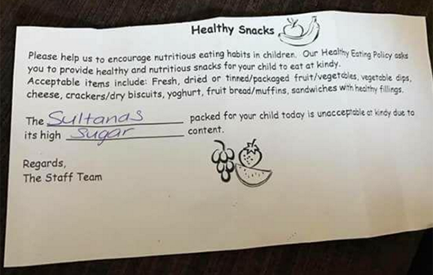 This is not the first, nor will it be the last incident of lunchbox shaming. Whilst we think it's fantastic that teachers are monitoring children's diets to make sure they are eating sufficiently nutritious food throughout the day, and, as the note says, "encourage nutritious eating habits", we think we're going to have to draw the line with sultana-shaming.