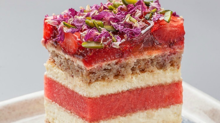 The layer cake is made from "two layers of almond dacquoise (like a meringue), rose-scented cream, watermelon, strawberries and garnished with pistachios and dried rose petals", producing quite a light, fragrant flavour on your tongue. Oh, and it's gluten-free, so nobody has to miss out on this taste sensation. Black Star recently posted to Instagram a pre-festival taster, and it looks like it will have the signature pistachio and petal toppings, a red cone and the ice cream will be pinkish in colour.