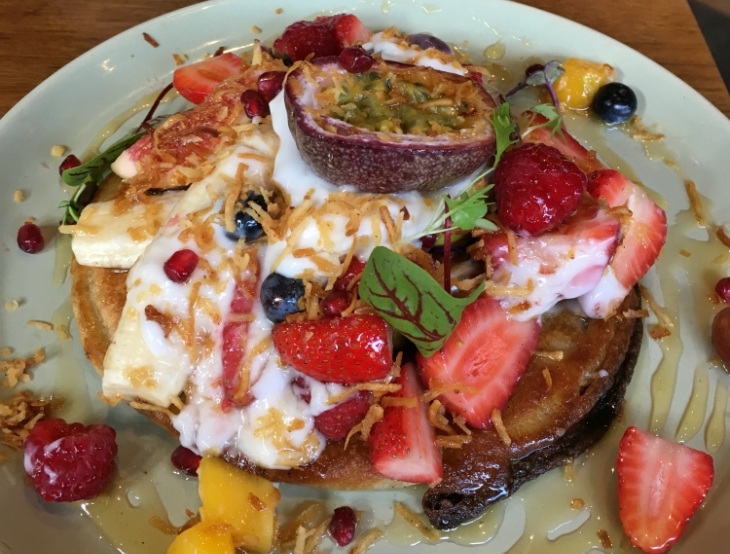 The Buckwheat Pancake. It's gluten free and dairy free, and arrives at our table ready for its Instagram photo. For $22 it's on the pricier side, but it's the size of a dinner plate and comes piled-high with quality fruit (figs, raspberries, strawberries) and a good few dollops of creamy coconut yoghurt.