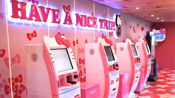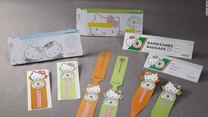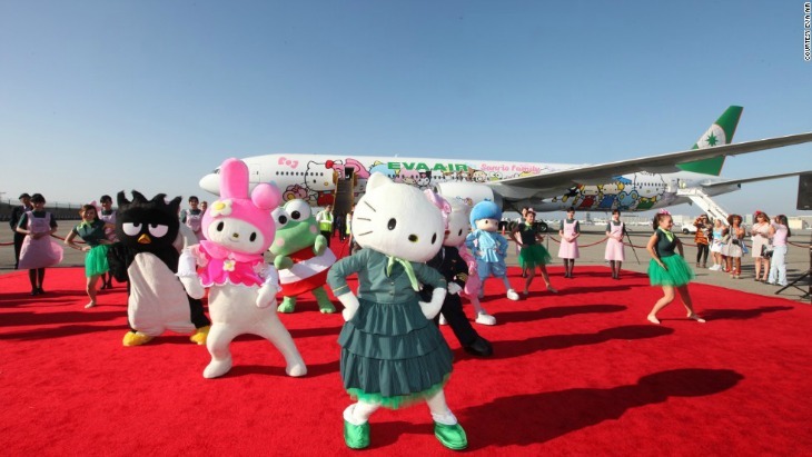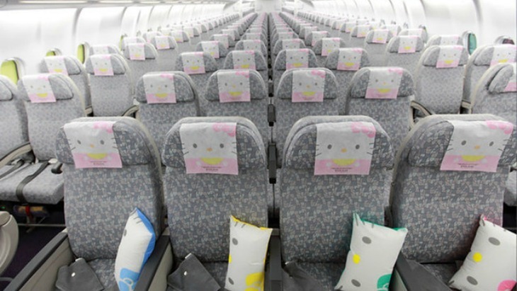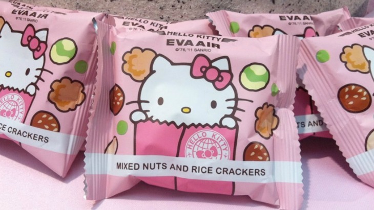 Flights depart from Tapei, the capital city of Taiwan, and travel around the world to destinations including Hong Kong, Paris, and even Houston, Texas. Instead of the airlines usual orange, green and white colour scheme, the "joyful dream jets" will be embossed with cartoon characters of all sorts, including Hello Kitty herself. The Sanrio (the creators of Hello Kitty and various other cartoon critters) and EVA AIR collaboration has really gone all out on their commitment to theme: you'll check-in at a pink and Hello Kitty themed area at the Taiwan airport, be given Hello Kitty luggage tags and boarding passes, and be ushered onboard by flight attendants donning Hello Kitty aprons. Once inside the jet, you'll find Hello Kitty headrests, Hello Kitty toilet paper in the bathrooms, Hello Kitty eating utensils, Hello Kitty toiletries, Hello Kitty napkins, tissues, pillows, Hello Kitty themed and packaged food, and just about everything else.