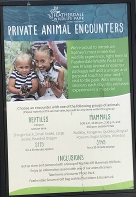A short while later we did the “Mammals” private encounter. This encounter is in a private cabana (nice for privacy, and also for containing kids). A zookeeper by the name of Patty introduced us to Winston (a baby roo), Bubble (a sugar glider) and a ring-tail possum whose name I can’t remember. Patty was great with our boys – she was able to answer all the usual wee and poo questions and she tried really hard to make sure everyone had plenty of opportunities to hold and / or pat each of the animals. There was a photographer in the cabana and she took some lovely photos of all of us patting and / or holding each of the mammals (2 complimentary photos are included in the price of the private encounter, more photos can be purchased for an additional charge).