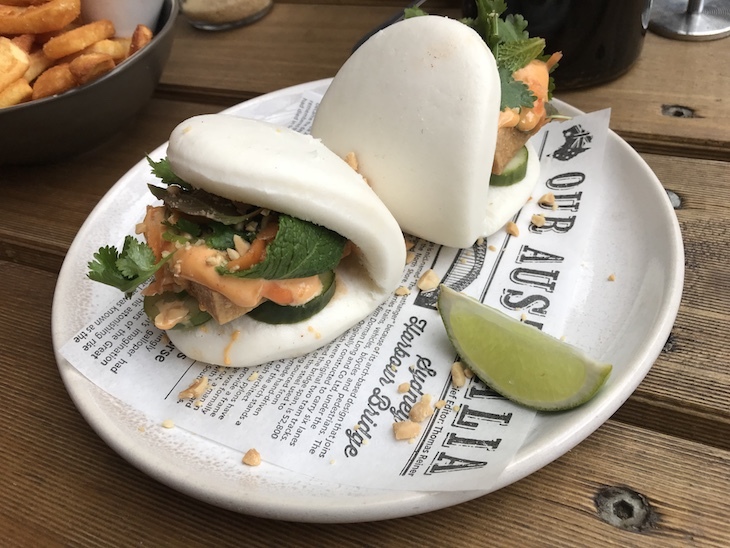 The adults had the shakshuka with harissa, eggplant and peppers, smoked almonds, labne, coriander and charred Turkish bread ($18.90) and the spicy tofu bao: soft, pillowy steamed bao buns filled with crispy tofu, house pickled carrot and cucumber, fresh Asian herbs, peanuts, spring onion and gojuchang mayo ($15 for two).