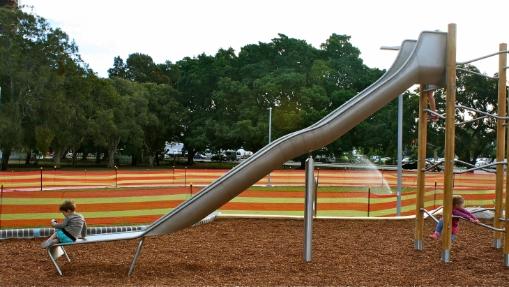 Toddlers will love the sandy area dedicated just to them with rocket ship slide and tipping buckets for scooping sand. Overlooking the Cooks River, it's a beautiful spot to have a picnic with lots of tree shade by the water and ample picnic tables.