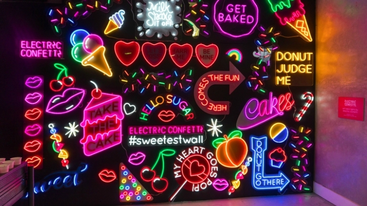 Cross a sherbet-filled rainbow bridge, a forest of giant bananas, a pink on pink installation, a larger-than life traditional lolly shop, an igloo of giant donuts, the interactive sprinkles wall, Australia’s first neon art wall and other sweet themed art throughout.