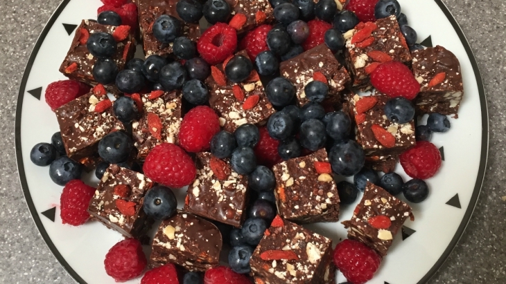 These mix and make choccies are a hit with health foodies and non-health foodies alike. Taking just 10 minutes to whip up, this recipe is loaded with nutritious ingredients like high protein peanuts and antioxidant rich cacao and goji berries. Use 70% dark chocolate for an even healthier, lower sugar version of the recipe.