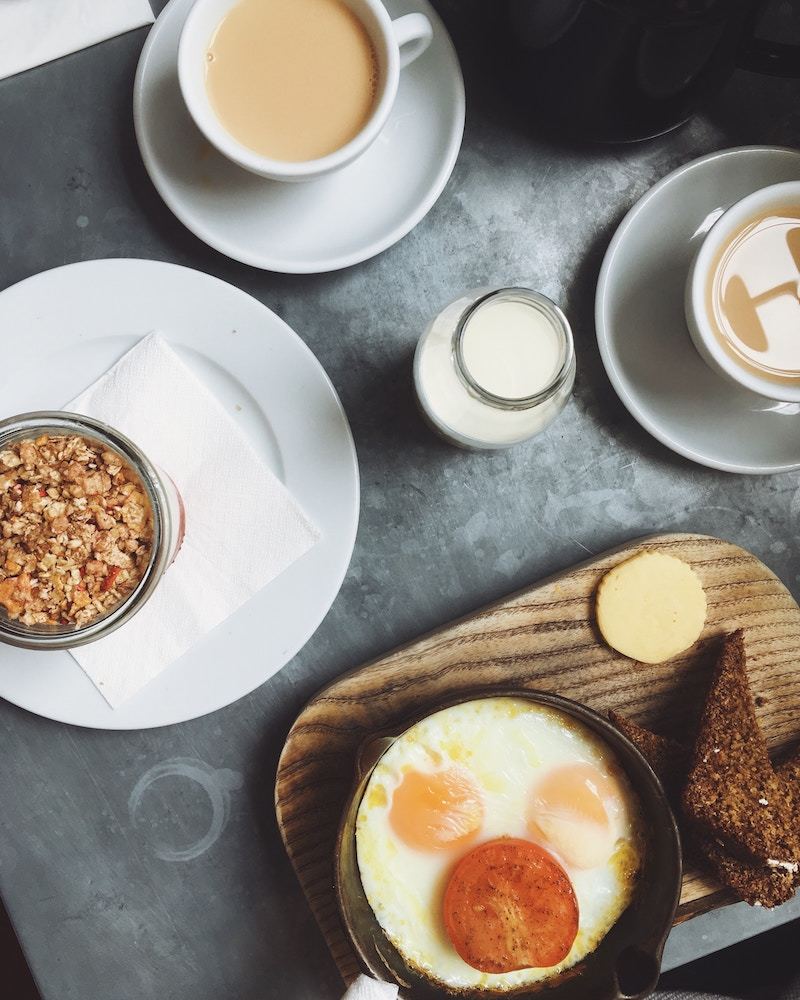 Why not make up individual pots of bircher muesli the night before? Or pop some eggs and tomatoes on puff pastry and bake until the eggs are golden? We also love crumpets dripping with butter or golden syrup, fresh fruit compote, egg in a hole, croissants stuffed with jarlsberg, or even just good thick-cut sourdough and a quality jam. All served alongside a chilled orange juice and good strong tea or coffee. Bon appetit!