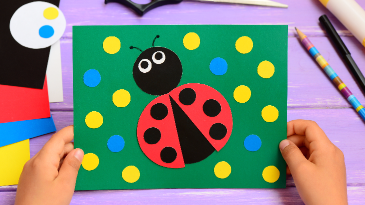 There are some trickier methods out there showing you how to make 3D lady beetles, but let's keep it nice and simple with this lady beetle art. All you need is various sheets of coloured paper or cardboard, scissors, glue, and maybe a marker pen.
