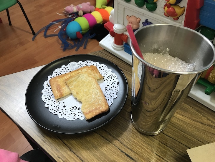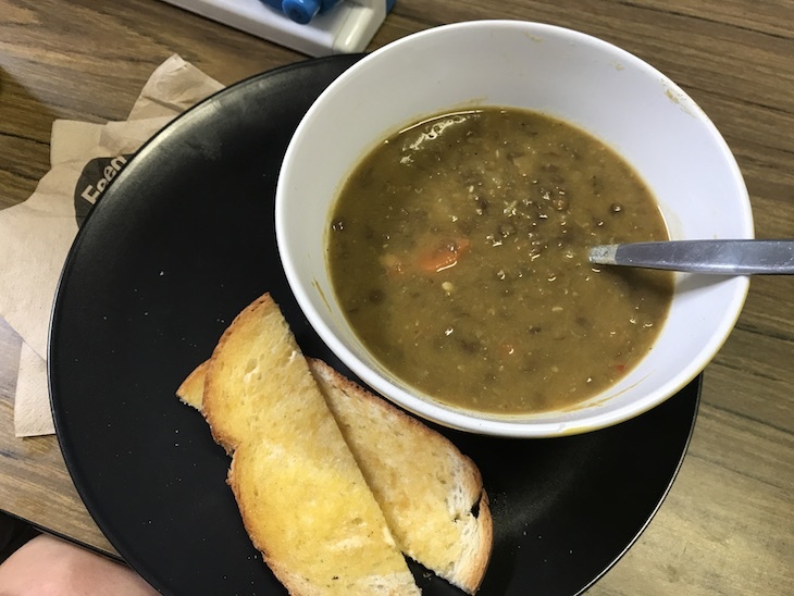The menu is simple and super-affordable. We opted for the soup of the day, which was brown lentil and utterly delicious, for $7.50, a toasted cheese sandwich for Smalls ($3.50), and a chocolate milkshake (which only comes in one size). All of it was hungrily devoured.
