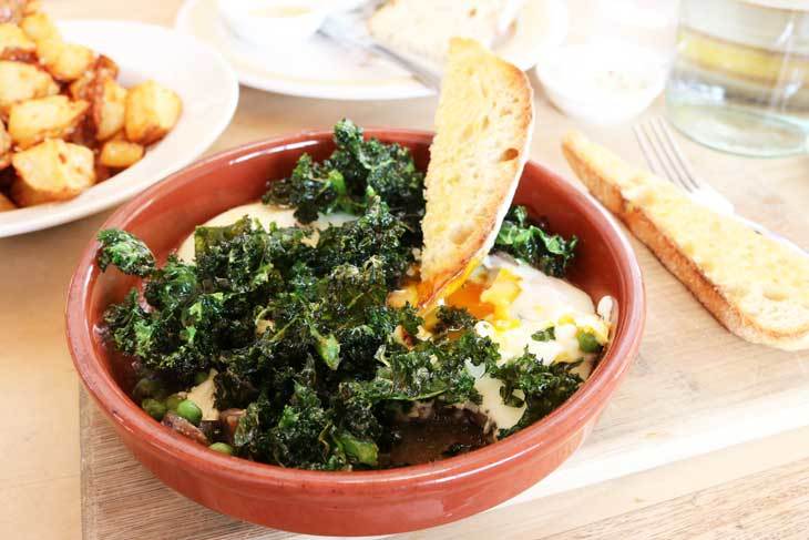 I found it difficult to choose a breakfast option or a burger, considering I was there at about 11.15. I evenutally chose the Swiss baked eggs with Swiss brown mushrooms and pea ragu, goat's cheese and crispy, crispy kale, which came with a slice of sourdough (I thought one slice would never be enough but I was wrong!) for $15.50. We also ordered The Merri Potatoes with chilli salt ($7), and Smalls had the sourdough with honey ($7).