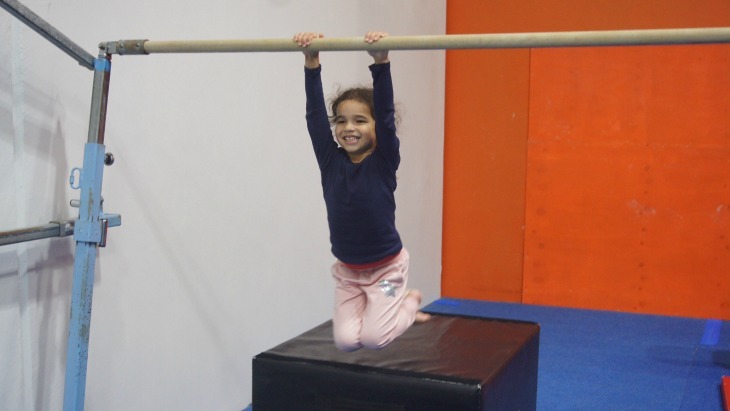 The class then moved on to another rotation, this time using the gymnastics apparatus with lots of padded cubes and supports. They swung from the uneven bars, climbed up onto the pommel horse, and climbed across the parallel bars. All the kids seemed to love swinging from the bars and jumping down onto the mats.