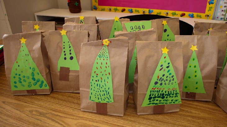 Check out this super cool idea for homemade gift bags by Mrs. Ricca’s Kindergarten. Your little helpers will be able to personalise their gift bags by decorating their own paper trees — functional art!