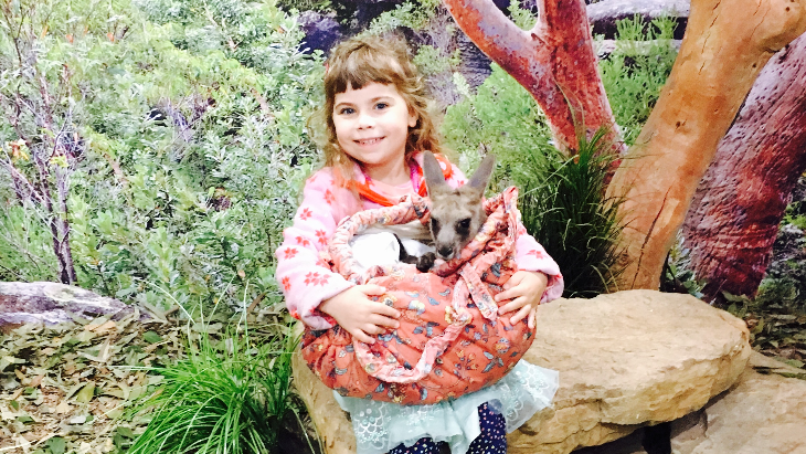 Jess told us we would be meeting three special animals and they were already in the room with us. We all looked around but curiously we couldn’t see any hint of an animal. Where (and what) were they? Jess picked up a bag and we saw a cute little face poking out of it. We were introduced to a little 6-month old Joey. Tabbitha, the adorable baby ‘roo had been rescued and brought to Featherdale when her mother had been run over. The kids were so excited to get a turn each to hold Tabbi.