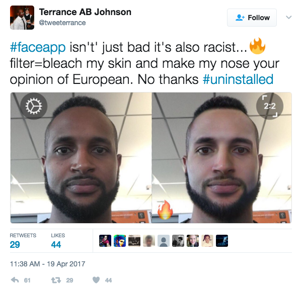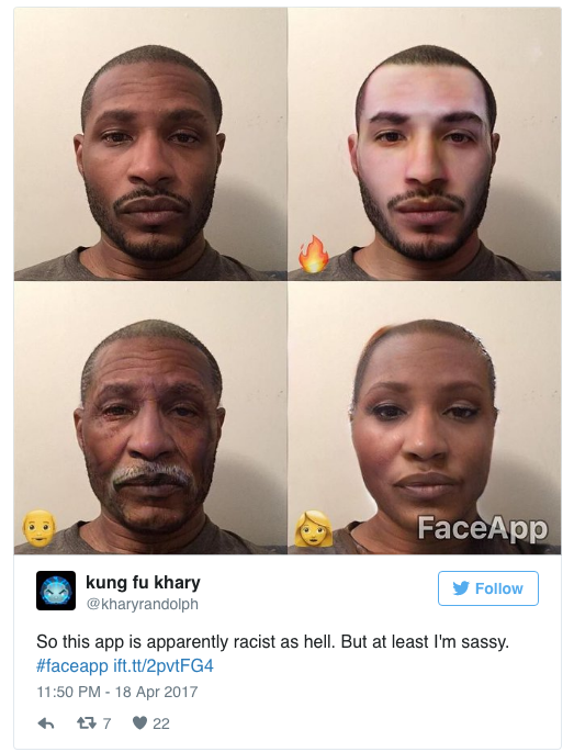FaceApp originally had a function called 'hotness' that, supposedly, made you 'hotter'. Many FaceApp users were disgusted to find that making them 'hotter' meant lighter skin, and a more European-style nose. FaceApp CEO Yaroslav Goncharov said: “We are deeply sorry for this unquestionably serious issue. It is an unfortunate side-effect of the underlying neural network caused by the training set bias, not intended behaviour. The feature is still available but has now been renamed “spark”, in an attempt to “exclude any positive connotation associated with it...We are also working on the complete fix that should arrive soon.” People, as you can imagine, were not impressed.