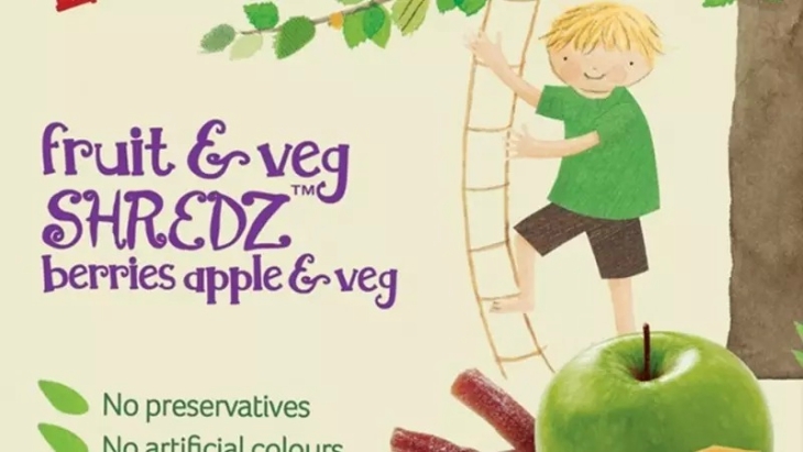 The cartoon on the front of the Little Kids Shredz Snacks packaging is of a young healthy boy climbing a tree - but in reality, this product would have given this youngster a ticket to the dentist, and a short-lived blood sugar spike - followed by a fast crash in energy, and likely, a nap!
