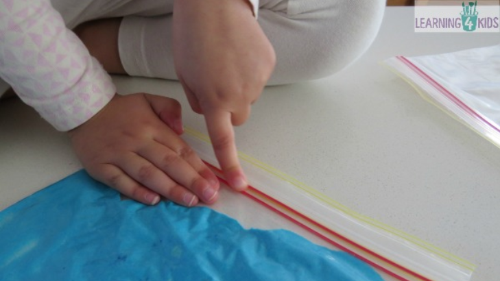Make different bags with different coloured buttons, and increase the number as your toddler progresses! They might just start out pushing the buttons around the gel and engaging their senses and fine motor skills.