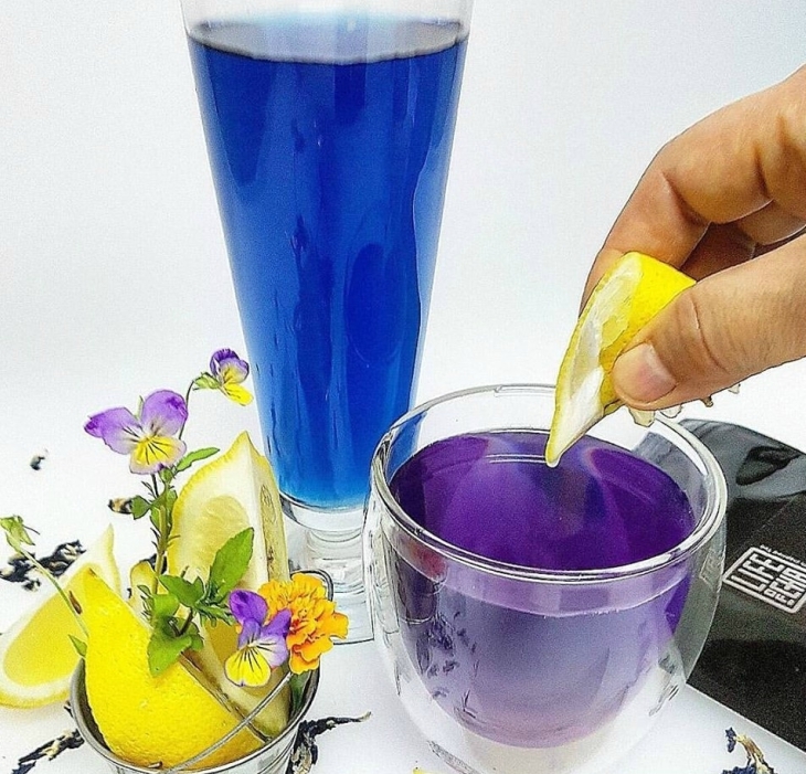 Simply add an acidic ingredient like a squeeze of lemon or lime juice to your cuppa hot Crystal Blue Tea and TADA! Watch it turn a vivid purple! A spoonful of honey also does the trick.