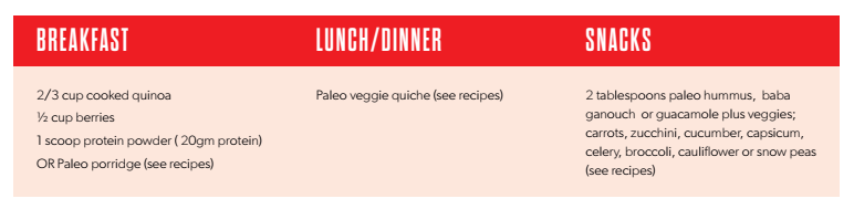 Sw2s is not just a fitness plan. As Blake tells me, you won't get results without changing your diet too. After all, 65% of the program is about the right food. He has teamed up with Sports Nutritionist and Natropath Kira Sutherland to bring you a 6 week food plan to clean up your diet. Yes, that means no more cheeky wines, choccy bickies and limiting your coffee intake from bucket to small cup. Look it's not as extreme as it sounds, but if you want the program to work, it's worth investing in a diet makeover. The recipes and menu ideas are actually pretty good, think lots of wholefoods, veggies and protein. Here's an example below of a meal plan: