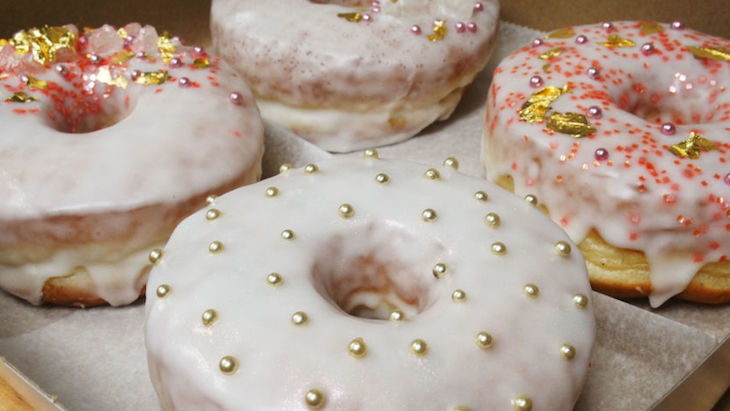 The sweet gooey donuts are slathered in icing that has processo mixed in. Then, as if that's not enough, they're sprinkled with edible glitter and gold flakes.