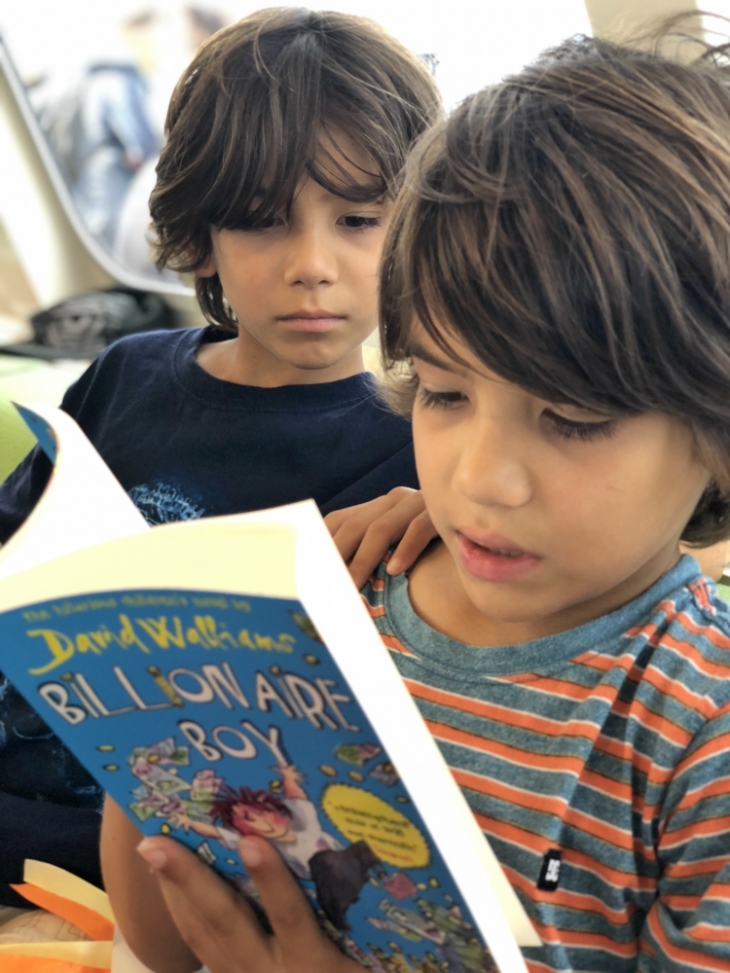On the ferry home, the trademark blue cover of Billionaire Boy surfaced from our backpack. Slowly but with quiet assurance, my boys started reading Chapter 1 aloud.