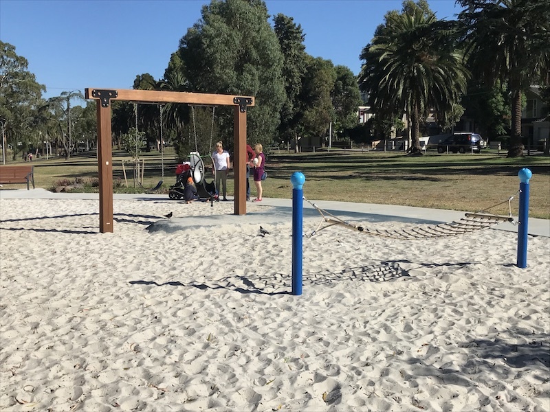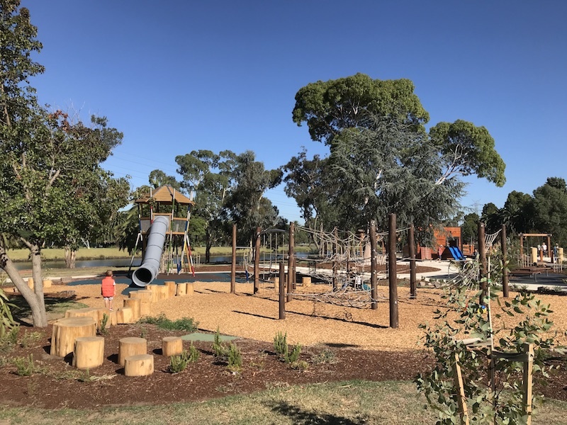 Also new is a (quite high) slide, stepping stones, a rock climbing area, nature play area, and hammocks for whiling away those lazy days. Extensive lawn abounds, with plenty of space for laying out a picnic rug under the trees or having a kick of a footy nearby. The walk along the river is pretty stunning, too.