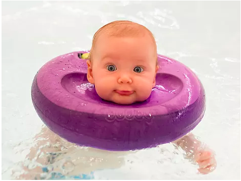 Tiny tots begin each session with a 10-30 minute immersion into a body of water, supported by the Bubby ®, a floatation device fitted around the babies' necks, allowing them to float freely, unaffected by gravity. There have been concerns about neck floatation devices for babies that were originally designed as medical devices for children with disabilities, including some recalls on inflatable plastic devices purchased on eBay. The Bubby ® used at Baby Spa was patented by founder Laura Sevenus, and has special cut outs for the ears and jaw bones that supposedly allow for support and stability.
