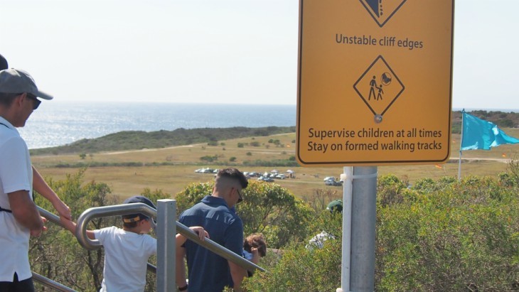 The track is a wonderful addition for the area but unfortunately for we parents, it's not pram (or disabled friendly). I thought this was a real shame, though I do acknowledge that it is a National Park and should be respected as such. The walkway is made from a gritty, hard steel/plastic substance that was easy to walk on. My four year old came on the walk with me and sadly tripped, resulting in some very nasty cuts to his little knees. Perhaps something to consider for parents – wear longer pants and as there is a lot of glass beside the pathway from midnight shenanigans, always ensure your kids are wearing the right shoes. As the sign says, supervise your children at all times. There are a couple of seats to rest on along the path and hand rails on the pathway.