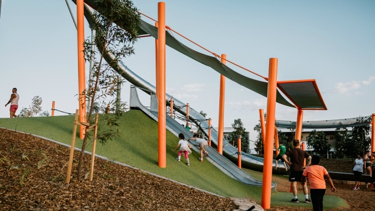 There is plenty for the older kids, including the park’s marquee feature, the 30m slide. The slide is accessed by climbing the stairs to the top of a tall tower, which gives sweeping views around the new housing estate and parklands, all the way to the Blue Mountains. Even if you don’t plan on going down the slide, it’s worth climbing to the top for the view alone. As well as the super slide, there is a decent ropes course, another smaller, but faster slide, flying foxes, a nest swing and another set of regular swings.