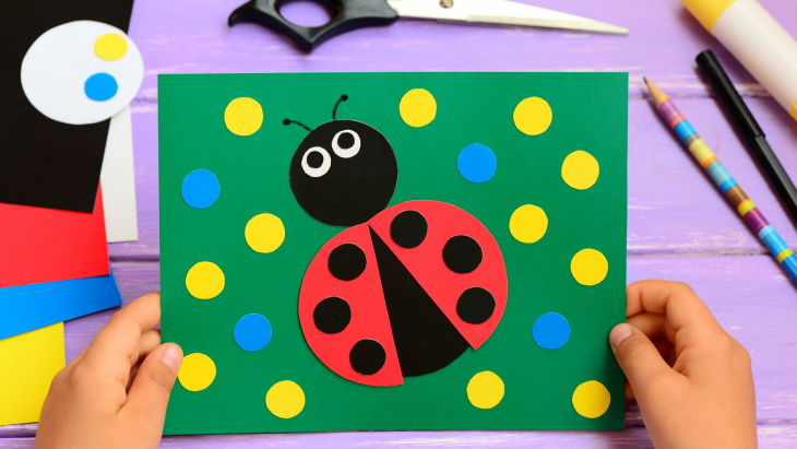 There are some trickier methods out there showing you how to make 3D lady beetles, but let's keep it nice and simple with this lady beetle art. All you need is various sheets of coloured paper or cardboard, scissors, glue, and maybe a marker pen.