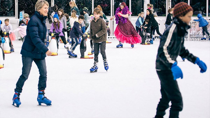 Adults are encouraged to get out on the ice with their kids, so skate aids are accessible for everyone, and helmets and skates are available for hire. For adults wanting to brush up on their skills before holding up all their kids out on the ice, free 15-minute lessons are available at certain times during the week.